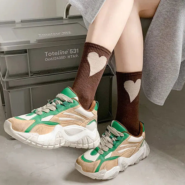 • Load image into Gallery viewer, Person wearing brown socks with heart patterns and beige and green sneakers in a minimal indoor setting.